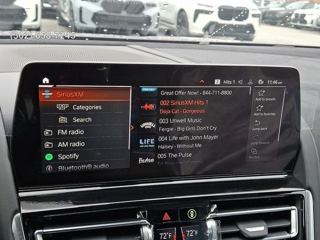 Connected Package Pro Limited Term, Driving Assistance Package (Active Blind Spot Detection, Active Park Distance Control with Side Protection, Driving Assistant, Parking Assistant Plus, Parking View with 3D View (Surround View), and Rear-View Camera), Driving Assistance Professional Package (Driving Assistant Professional, Lane Change Assistant, Partial Automated Driving, and Traffic Jam Assistant), M Performance Package, M Sport Professional Package (Extended Shadowline Trim, M Shadowline Lights, and M Sport Brakes with Black Calipers), 16 Speakers, 4-Wheel Disc Brakes, ABS brakes, Adaptive suspension, Air Conditioning, Alloy wheels, AM/FM radio: SiriusXM, Anthracite Alcantara Headliner, Apple CarPlay and Android Auto Compatibility, Auto High-beam Headlights, Auto tilt-away steering wheel, Auto-dimming door mirrors, Auto-dimming Rear-View mirror, Automatic temperature control, BMW Assist ECall, BMW TeleServices, Bowers & Wilkins Diamond Surround Sound System, Brake assist, Bumpers: body-color, Carbon Fiber Trim, ConnectedDrive Services, Delay-off headlights, Driver door bin, Driver vanity mirror, Dual front impact airbags, Dual front side impact airbags, Electronic Stability Control, Emergency communication system: BMW Assist eCall, Enhanced USB and Bluetooth®, Exterior Parking Camera Rear, Four wheel independent suspension, Front anti-roll bar, Front Bucket Seats, Front Center Armrest, Front dual zone A/C, Front reading lights, Front Ventilated Seats, Fully automatic headlights, Garage door transmitter, Glass Controls, Harman/Kardon Surround Sound System, harman/kardon® Speakers, Heads-Up Display, Heated door mirrors, Heated front seats, Heated Front Seats, Armrests and Steering Wheel, Heated steering wheel, Illuminated entry, Leather Shift Knob, Leather steering wheel, Live Cockpit Pro with Navigation, Low tire pressure warning, M Carbon Roof, Memory seat, Multi-Functional Seats, Navigation System, Occupant sensing airbag, Outside temperature display, Overhead airbag, Panic alarm, Passenger door bin, Passenger vanity mirror, Power door mirrors, Power driver seat, Power moonroof, Power passenger seat, Power steering, Power windows, Radio data system, Radio: AM/FM Audio System, Rain sensing wipers, Rear air conditioning, Rear anti-roll bar, Rear dual zone A/C, Rear Window Blind, Rear window defroster, Remote keyless entry, Security system, SiriusXM with 360L and 1 Year Trial Subscription, Speed control, Speed-sensing steering, Speed-Sensitive Wipers, Split folding rear seat, Sport steering wheel, Steering wheel memory, Steering wheel mounted audio controls, Tachometer, Telescoping steering wheel, Tilt steering wheel, Traction control, Trip computer, Turn signal indicator mirrors, Variably intermittent wipers, Ventilated front seats, WiFi Hotspot, and Wireless Charging.